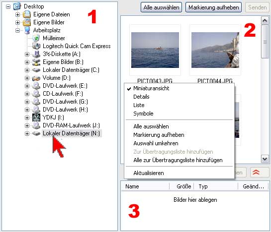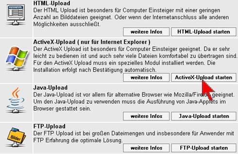 'Bilderservice' und danach auf '1.Schritt-Übertragen' Klicken Sie nun bitte mit der linken Maustaste auf 'ActiveX-Upload starten'